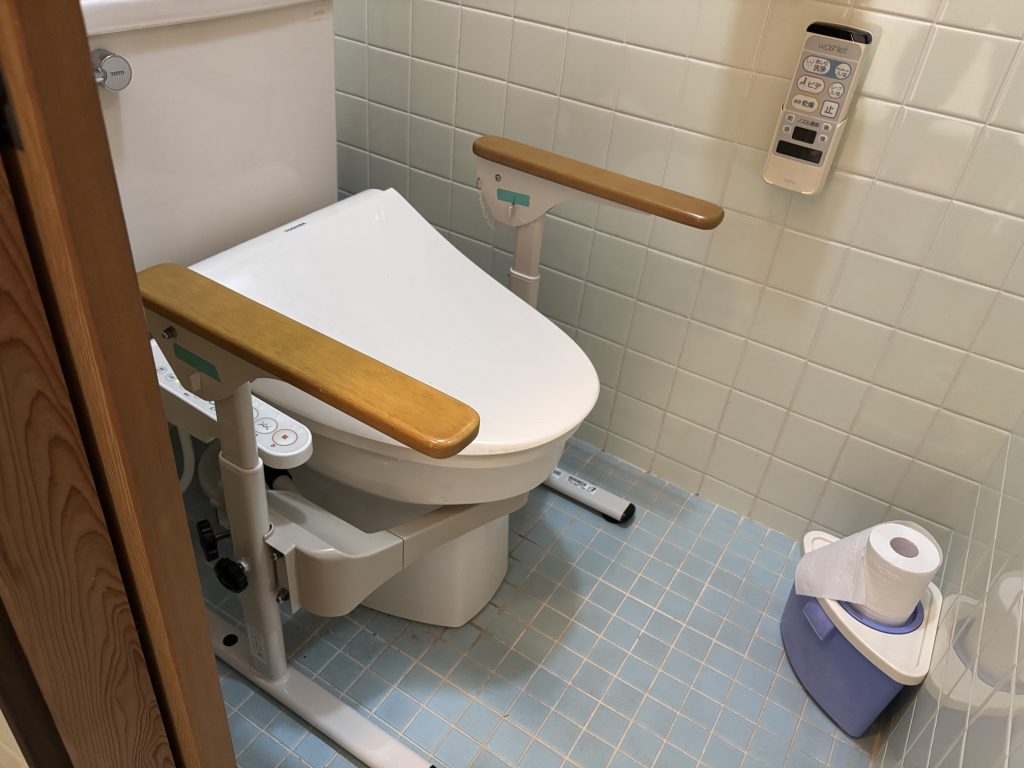 洋式トイレには、肘掛がある事で立ち座りが楽に行える福祉用具貸与の洋式トイレ用フレームSはねあげR2を設置しています。