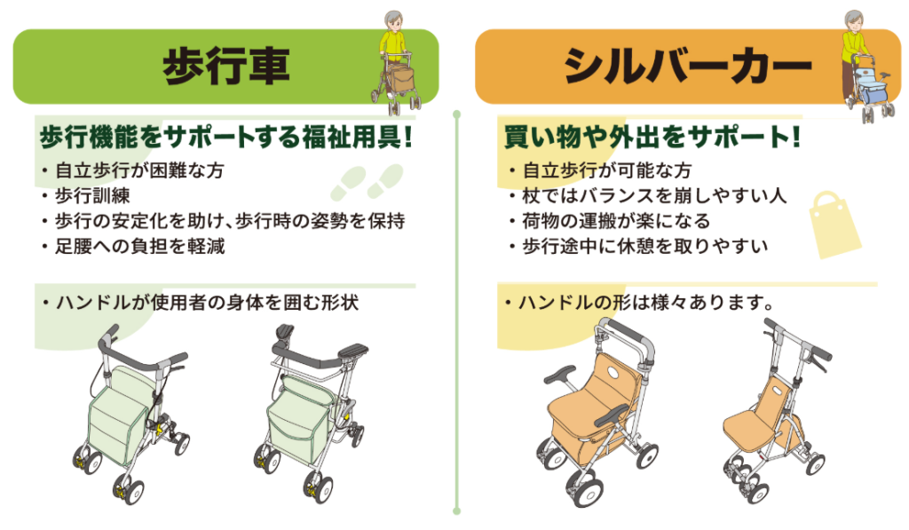 さて、屋外などで活動する際、杖だけでは歩行に不安を感じてきた、そんな時、歩行を補助する用具で歩行器(歩行車)やシルバーカーを使用するのを勧められることもあるかと思います。では、歩行器(歩行車)とシルバーカーは何が違うのか・・・一番の違いは自立歩行の状態にあります。シルバーカーは体を支える作りにはなっていません。