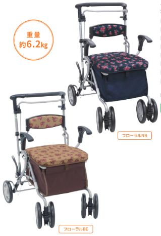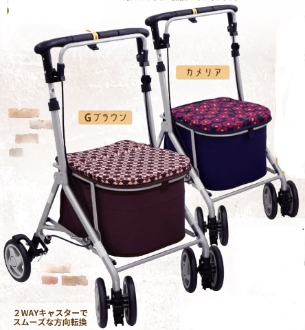 歩行車の分類になり、シルバーカーより安定しています。片方のブレーキ操作で両後輪を制御でき、また、幅50㎝なので狭い箇所でも小回りが効き、操作しやすく扱いやすい大きさです。カラーは4色展開です。