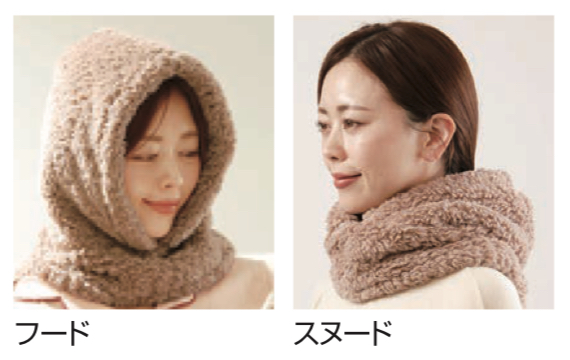 頭から顔、首までをすっぽり包み込む、ふかふかのフードマスクです。顔にあたるマスク部分は肌に優しいシルク100%。ネックウォーマーだけでも使用できます。