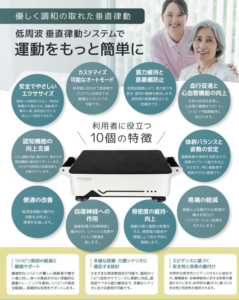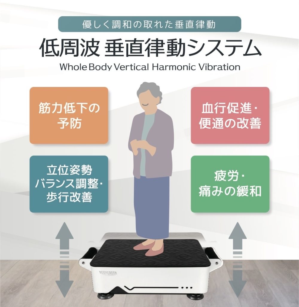 よくあるブルブルマシンとは違う低周波と垂直律動を組み合わせたマシンで、体にやさしく効果的なトレーニングが可能な商品のご紹介です。