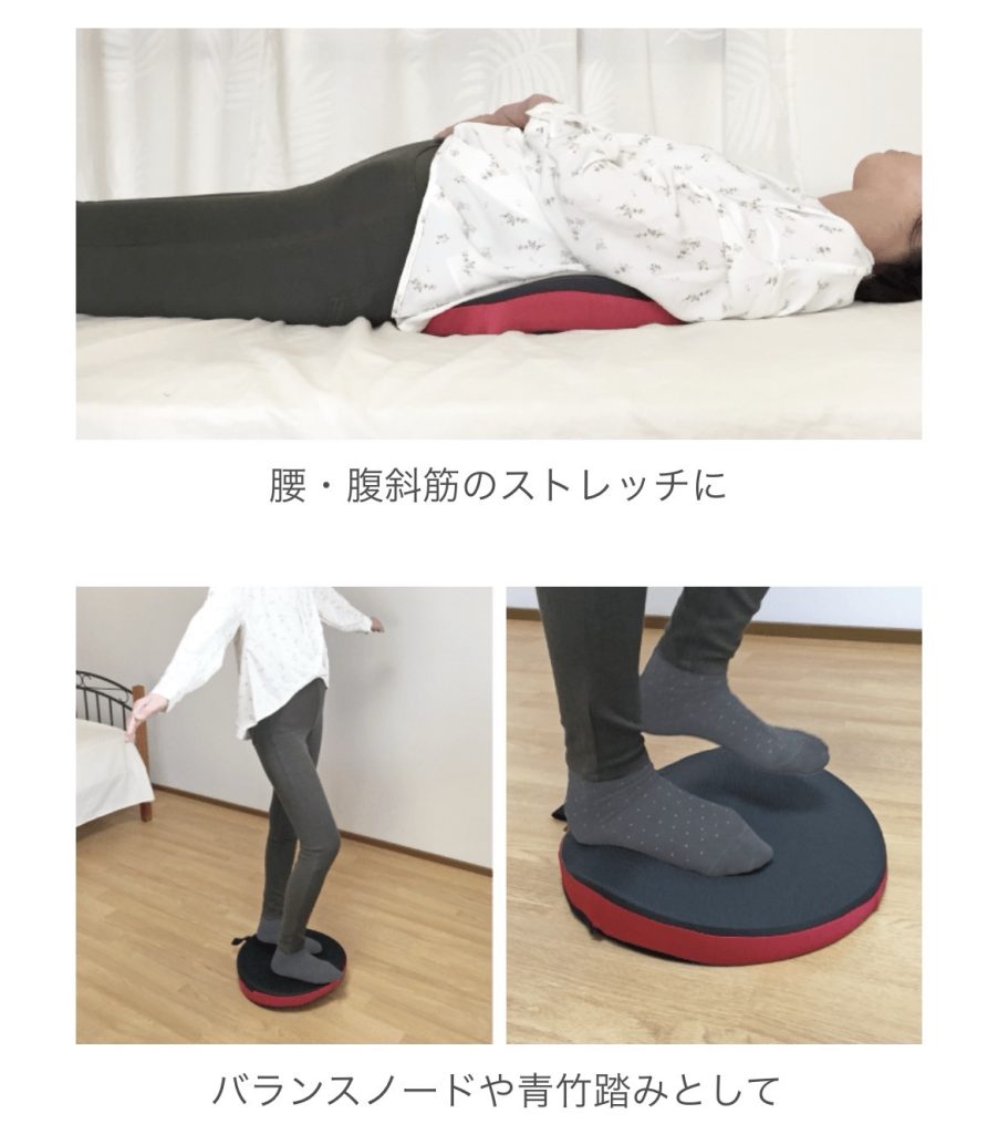 足を乗せ前後左右にゆらゆらと動かすだけの手軽な運動器具です。腰、腸斜筋のストレッチや立って乗るとバランスノードや青竹踏みとしても使えます。カラーはエンジと藍があります。